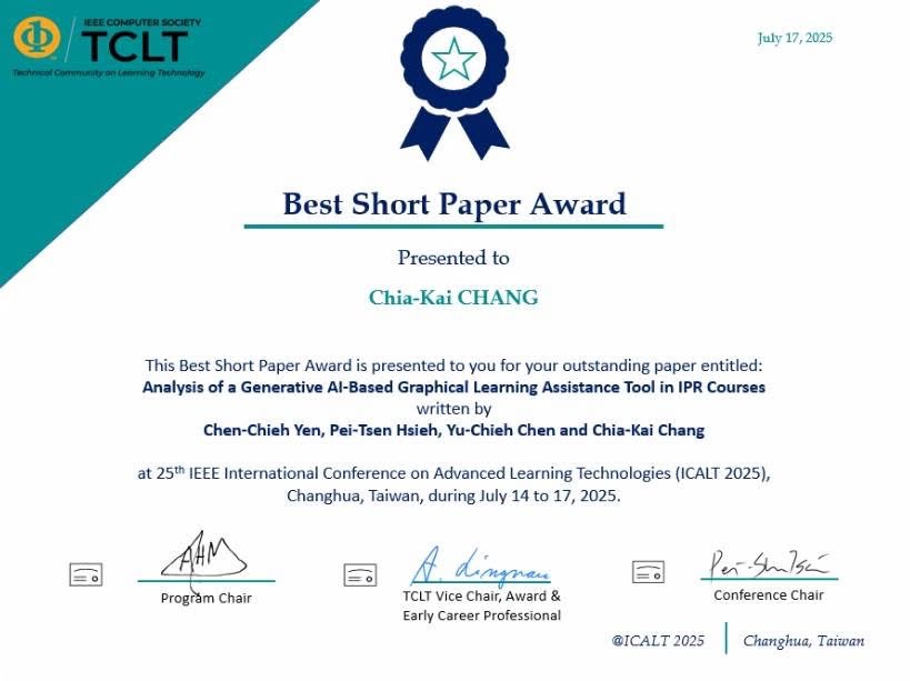 ICALT 是 IEEE 旗下歷史最悠久的教育科技研討會之一,至今已舉辦 26 屆。會議涵蓋自適應學習、行動科技、遊戲化學習、學習分析、AI 教育應用等 14 個專題軌道,是教育科技領域的重要國際學術平台。